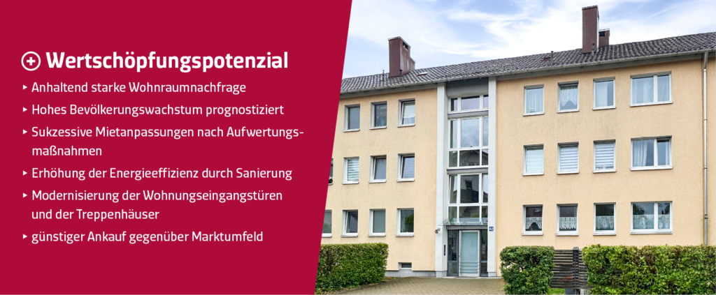 Mit gezielten Renovationen – von energetischer Sanierung bis zur optischen Aufwertung – wird das Objekt weiterentwickelt und langfristig wertstabil positioniert. Zu den Planungen gehört u.a. die Installation eines Wärmedämmverbundsystems, die Überarbeitung der Balkone, das Erneuern von Klingel- und Briefkastenanlagen und die optische Aufwertung von Treppenhäusern nebst Wohnungeingangstüren. Schon ohne die Umsetzung dieser Maßnahmen lassen Neuvermietungen erhöhte Einnahmen von ca. 20 Prozent erwarten.